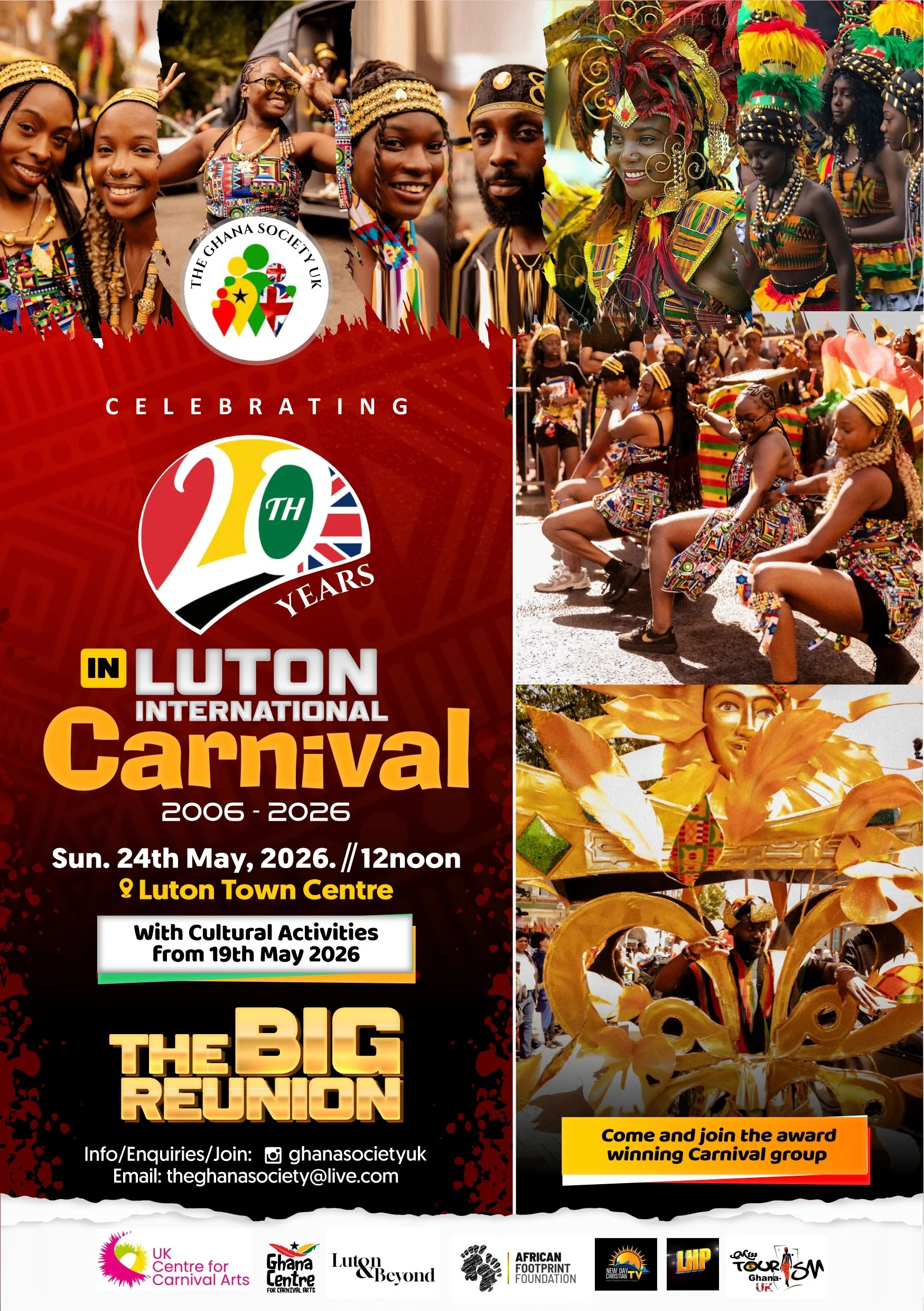 As Luton International Carnival prepares to celebrate its 50th Anniversary on Sunday 24 May 2026, one of its longest-standing community partners will also mark a significant milestone: The Ghana Society celebrates 20 years of bringing vibrant Ghanaian heritage to Luton's streets.